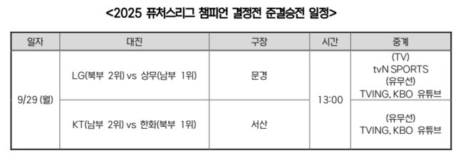 이로써 29일 열리는 2025 퓨처스리그 챔피언 결정전 준결승전은 북부리그 1위 한화와 남부리그 2위 KT, 남부리그 1위 상무와 북부리그 2위 LG로 대진이 확정됐다.