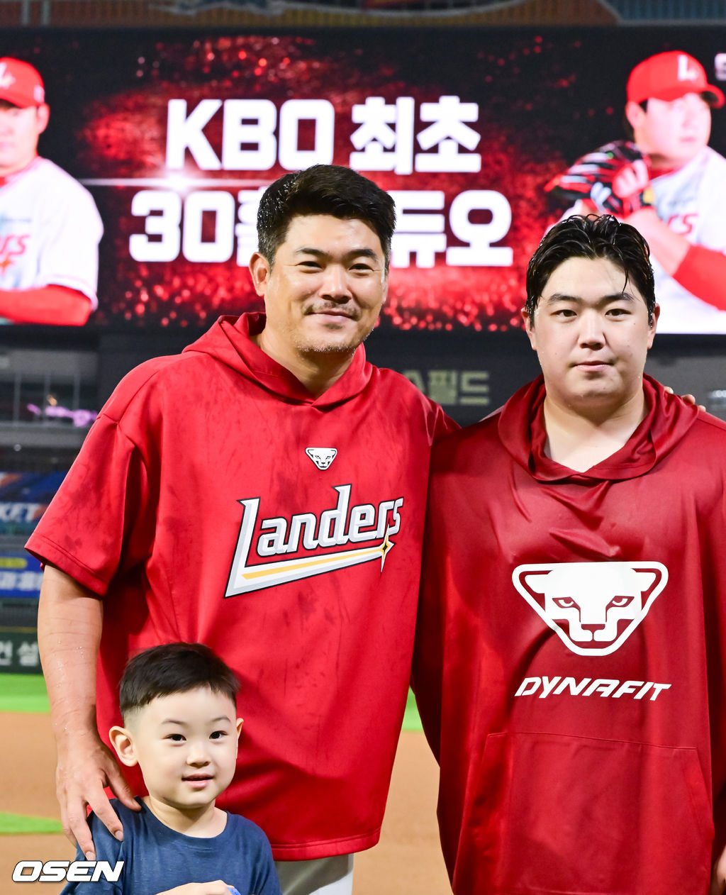 경기종료 후 KBO 최초 30홀드 듀오 달성한 노경은과 이로운이 포즈를 취하고 있다. 2025.09.25 / soul1014@osen.co.kr