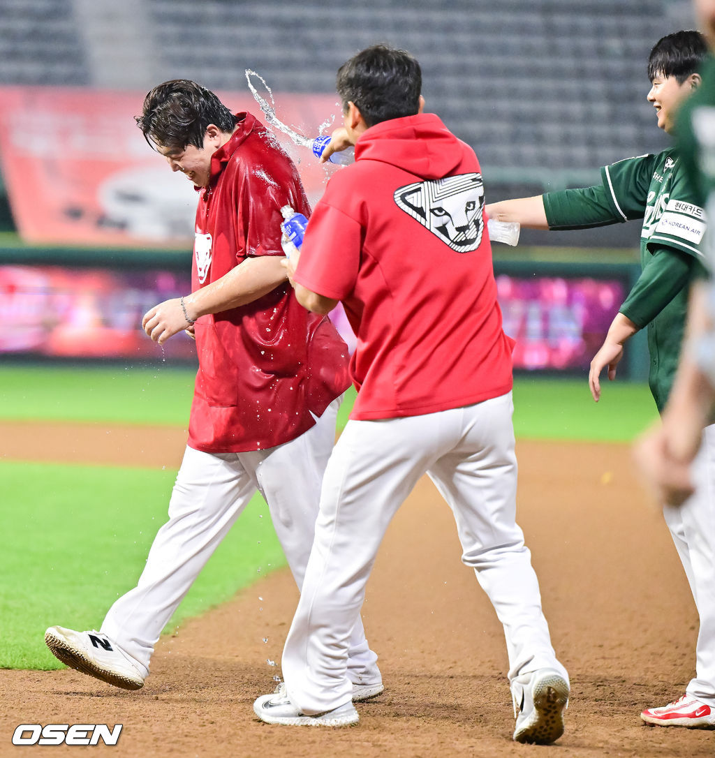 경기종료 후 김민과 노경은이 30홀드 달성한 이로운을 향해 축하 물세례를 하고 있다. 2025.09.25 / soul1014@osen.co.kr