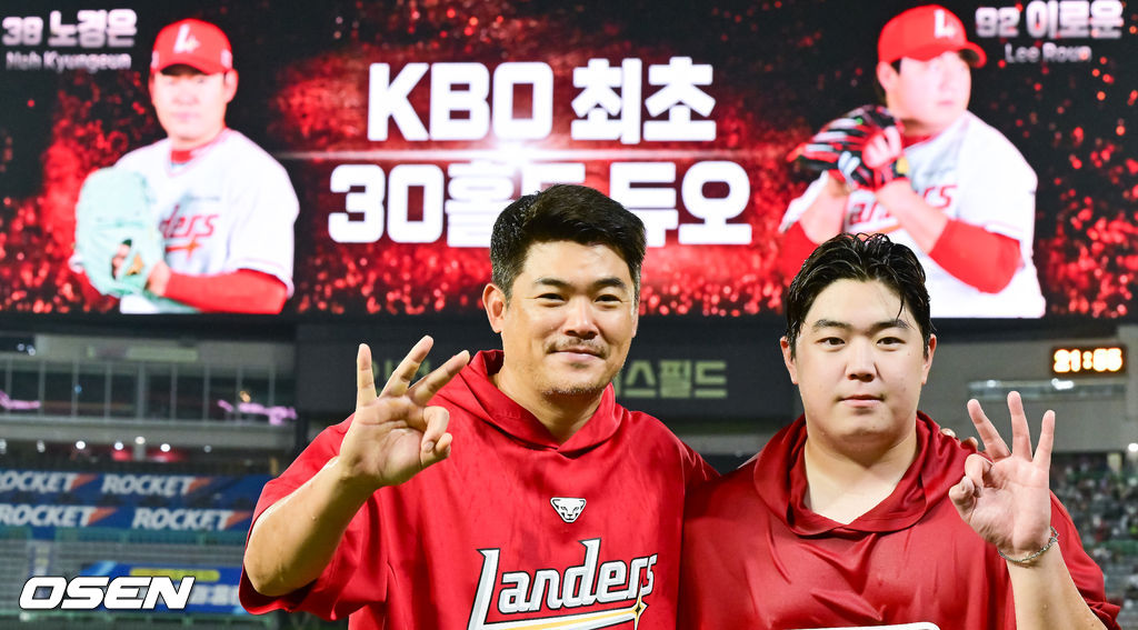 경기종료 후 KBO 최초 30홀드 듀오 달성한 노경은과 이로운이 포즈를 취하고 있다. 2025.09.25 / soul1014@osen.co.kr