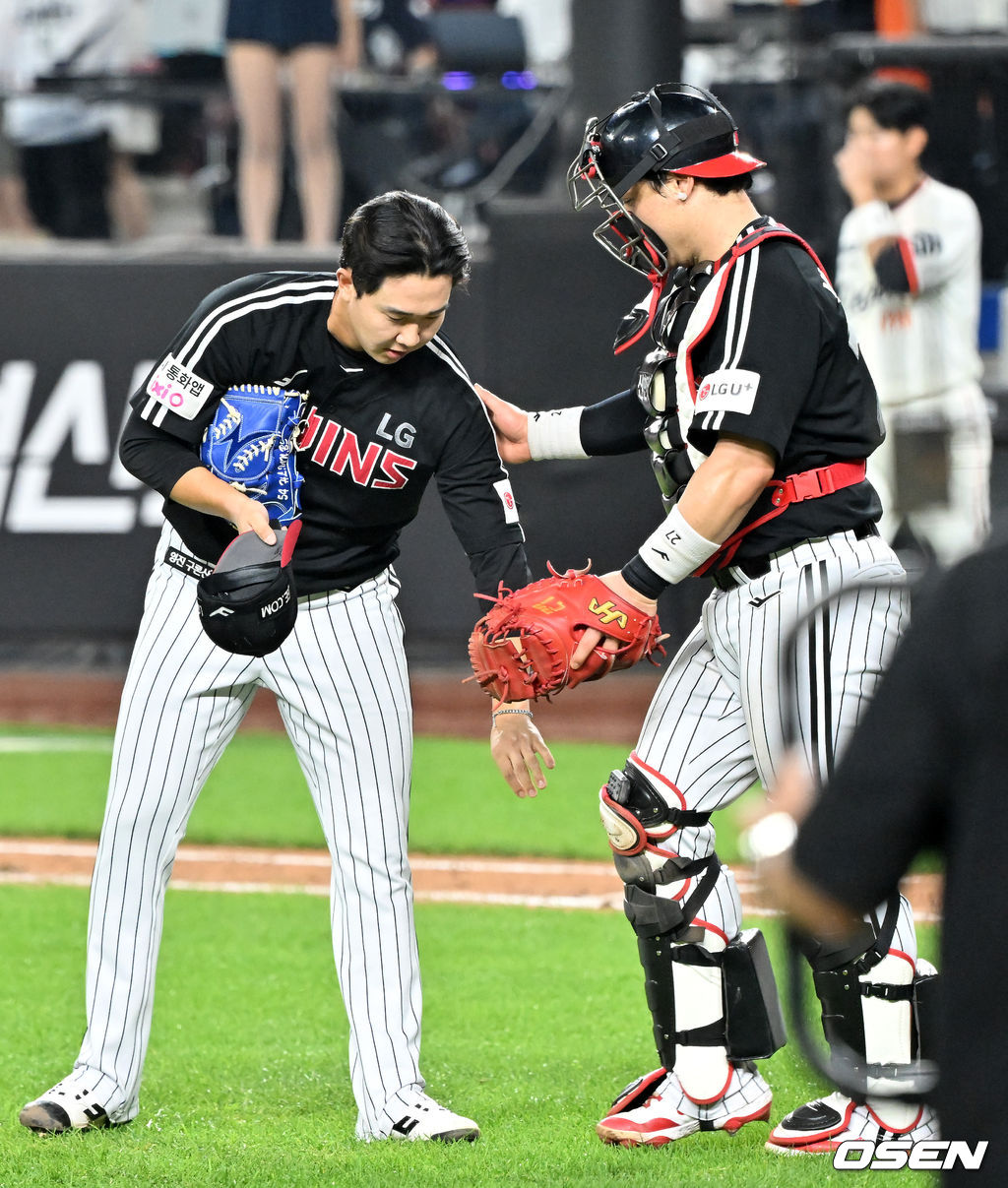 경기를 마치고 LG 유영찬이 박동원과 하이파이브를 하고 있다. 2025.09.27 /rumi@osen.co.kr