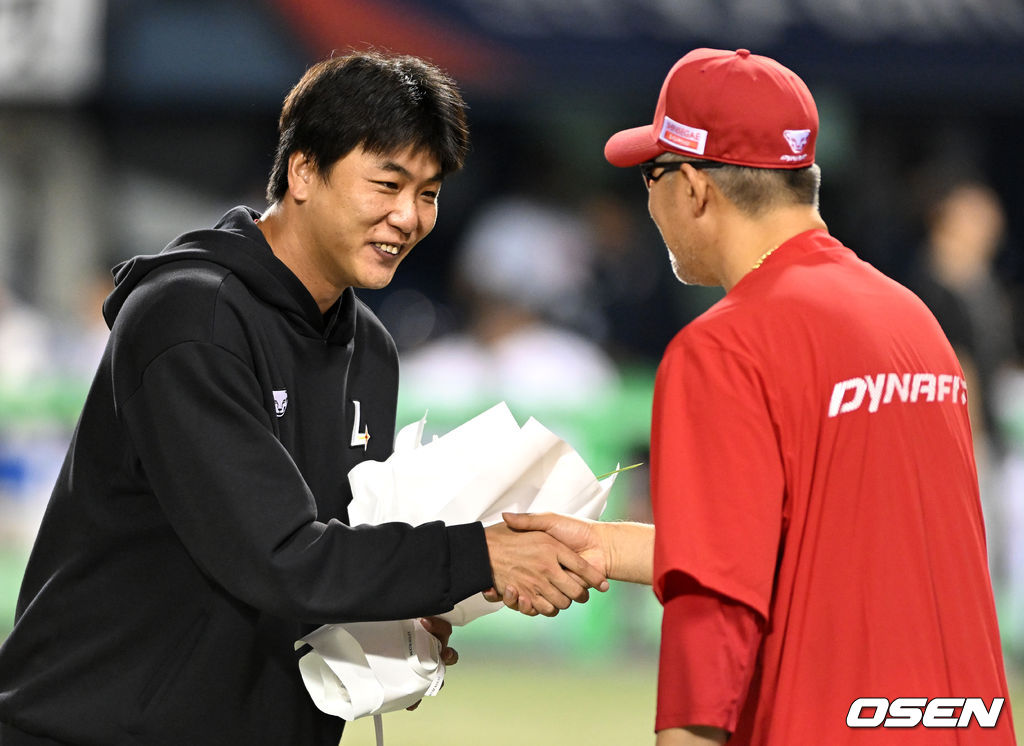 경기 종료 후 SSG 이숭용 감독이 12시즌 10승을 달성한 김광현에게 꽃다발을 건네고 있다. 2025.09.27 /sunday@osen.co.kr