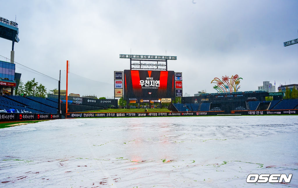 이날 새벽부터 대전 지역에 내린 비가 오전에도 멈추지 않고 있다. 오전 11시 기준으로 시간당 6.8mm 적잖은 강수량을 보이고 있다. 내야에 대형 방수포를 깔았지만 외야와 나머지 그라운드는 빗물로 젖었다.