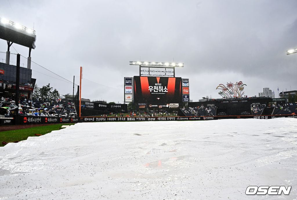 프로야구 LG 트윈스의 정규리그 우승 확정이 비로 인해 미뤄졌다. 1시간 지연 시작 목표로 그라운드를 정비했으나, 오락가락하는 비 때문에 방수포를 걷었다가 다시 깔면서 대기 시간이 길어지자 결국 우천 취소 결정이 났다.