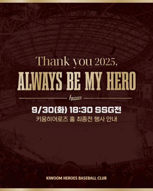 프로야구 키움 히어로즈는 오는 30일 오후 6시 30분 서울 고척스카이돔에서 열리는 SSG 랜더스와 경기에 앞서 2025시즌 홈 최종전 행사 ‘THANK YOU 2025, ALWAYS BE MY HERO’를 진행한다.