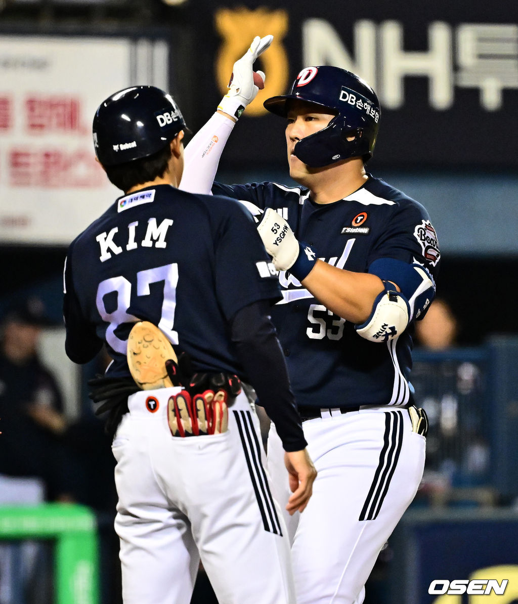 4회초 1사 1루 두산 양석환이 선제 투런 좌월 투런포를 날리며 김재현 코치와 기뻐하고 있다. 2025.09.30 /jpnews@osen.co.kr