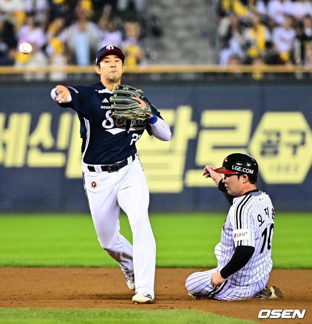 7회말 1사 1루에서 두산 강승호가 LG 김현수의 유격수 땅볼에 오지환을 포스아웃시키고 1루로 송구하고 있다. 2025.09.30 /jpnews@osen.co.kr