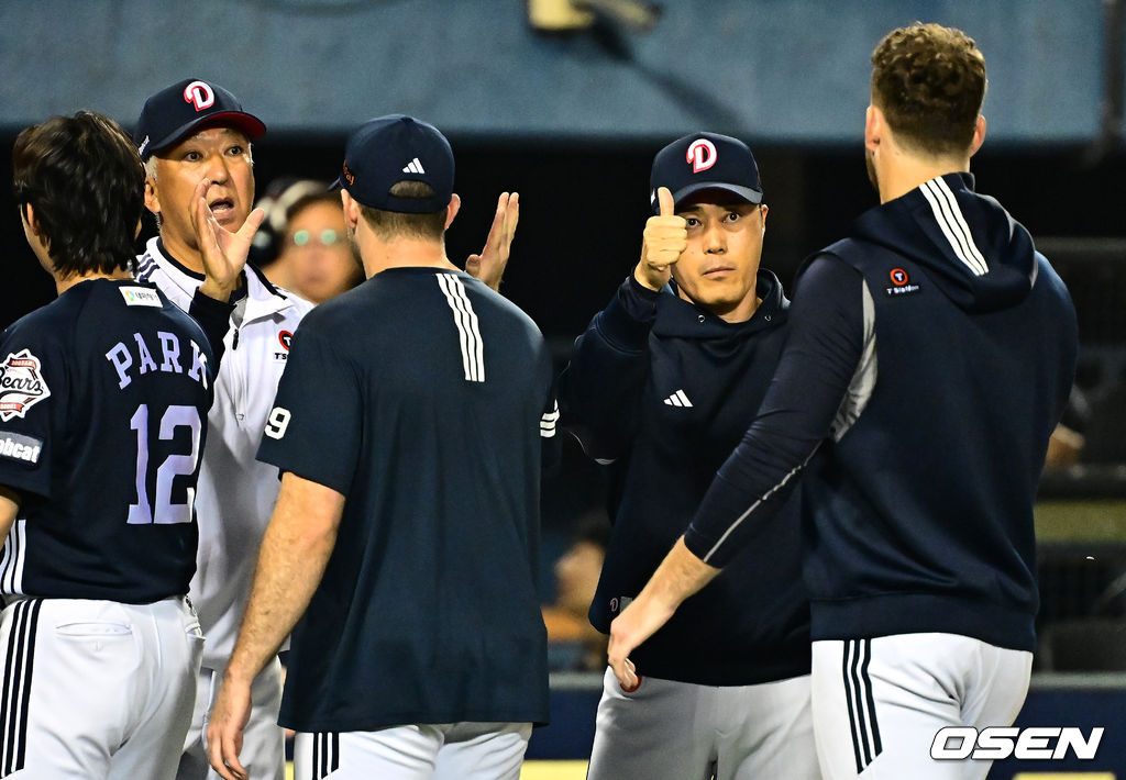 경기를 마치고 두산 조성환 감독대행이 콜어빈과 승리를 기뻐하고 있다. 2025.09.30 /jpnews@osen.co.kr
