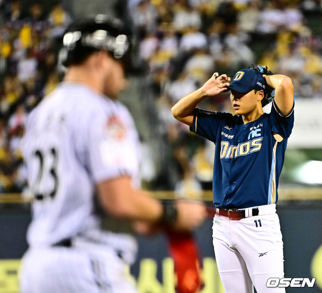1회말 2사에서 NC 김태경이 LG 오스틴에 볼넷을 허용하며 아쉬워하고 있다. 2025.10.01 /jpnews@osen.co.kr