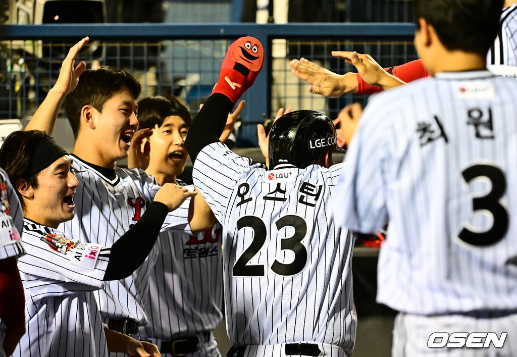 1회말 2사 2루에서 LG 오스틴이 김현수의 선제 적시타에 득점에 성공하며 동료선수들과 기뻐하고 있다. 2025.10.01 /jpnews@osen.co.kr