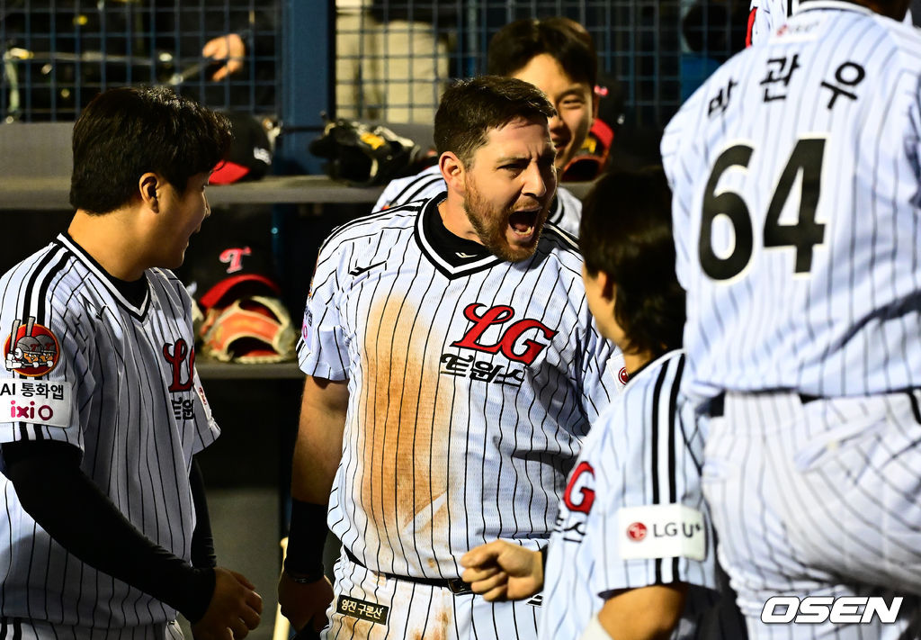 1회말 2사 2루에서 LG 오스틴이 김현수의 선제 적시타에 득점에 성공하며 동료선수들과 기뻐하고 있다. 2025.10.01 /jpnews@osen.co.kr