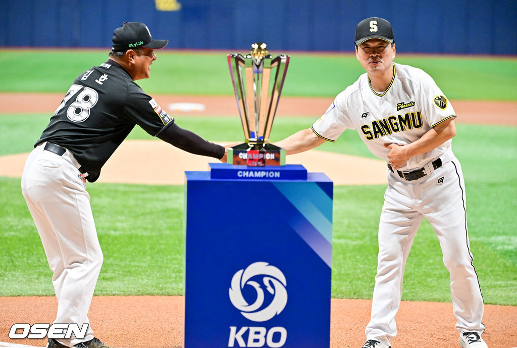 KT 김호 감독-상무 박치왕 감독,'초대 우승 트로피를 두고'