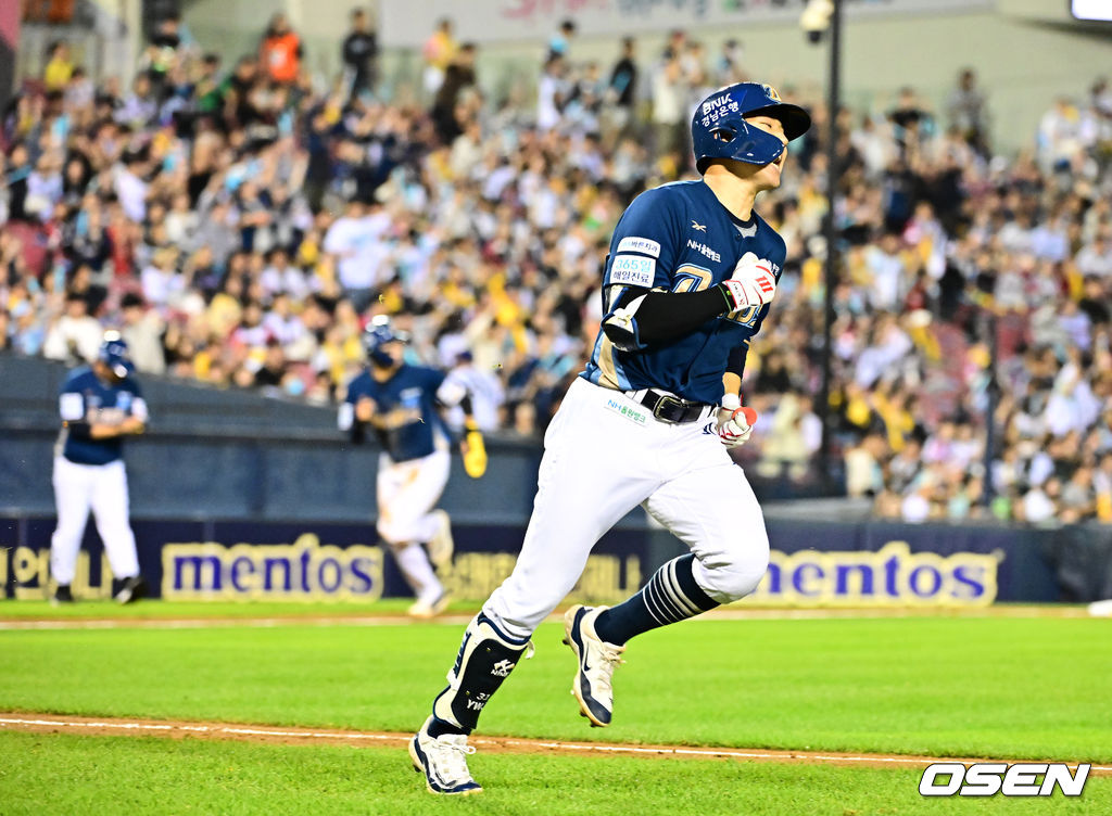 3회초 1사 3루에서 NC 최원준이 동점 1타점 우전 적시타를 날리며 기뻐하고 있다. 2025.10.01 /jpnews@osen.co.kr