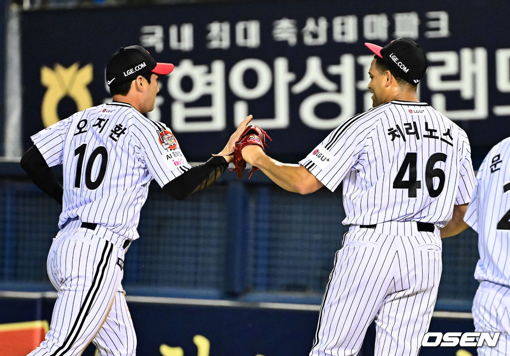 1회초 수비를 마치고 LG 치리노스가 호수비를 선보인 오지환과 하이파이브를 하고 있다. 2025.10.01 /jpnews@osen.co.kr