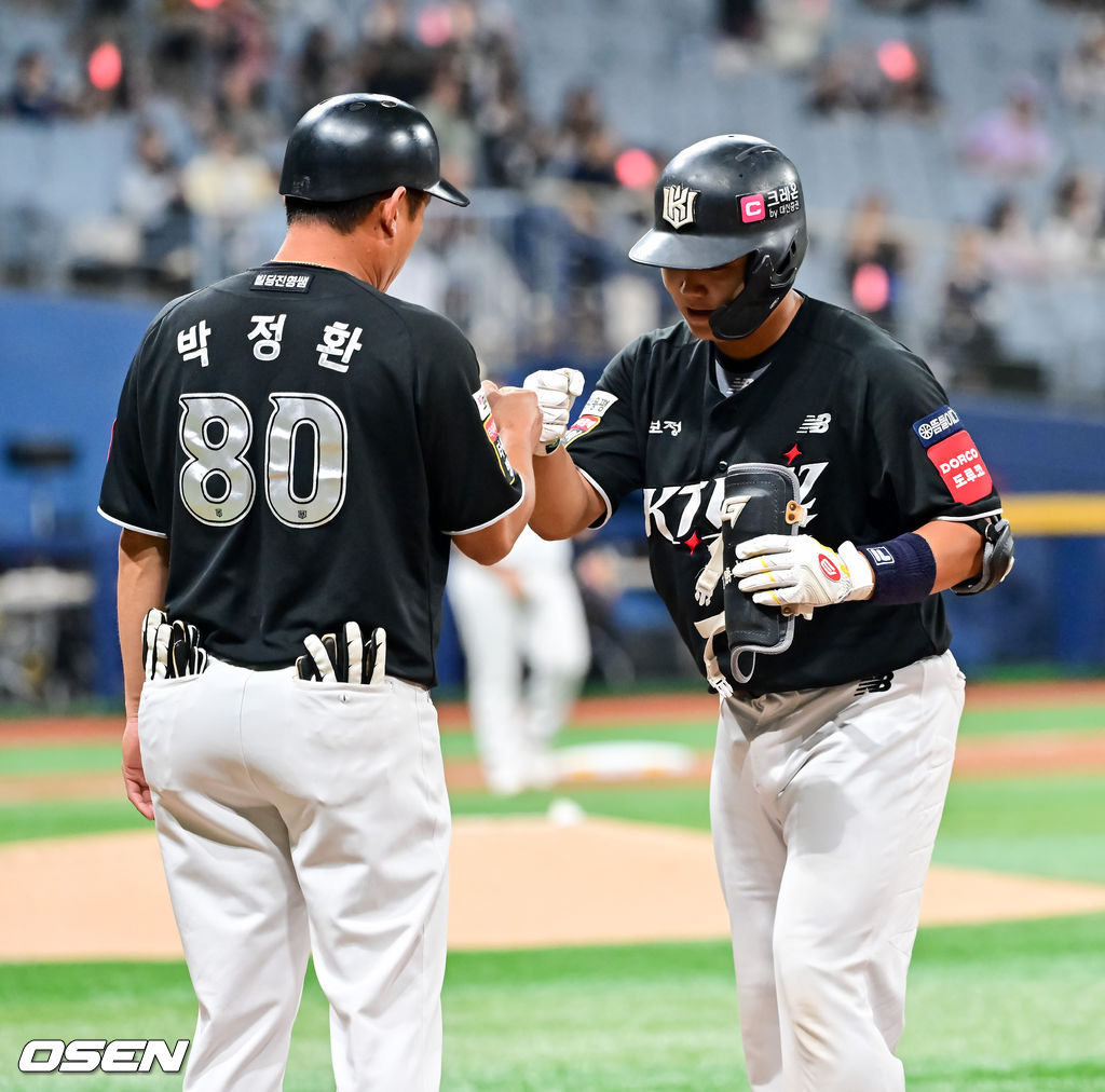 2회초 무사 2루 KT 김민석이 1타점 적시타를 날린뒤 박정환 코치와 하이파이브를 하고 있다. 2025.10.01 / soul1014@osen.co.kr