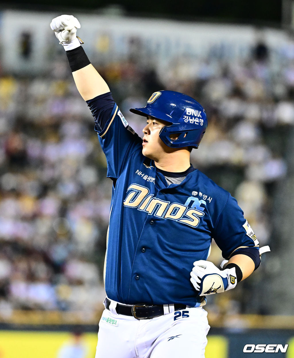 4회초 1사 만루에서 NC 김형준이 2타점 중전 적시타를 날리며 기뻐하고 있다. 2025.10.01 /jpnews@osen.co.kr