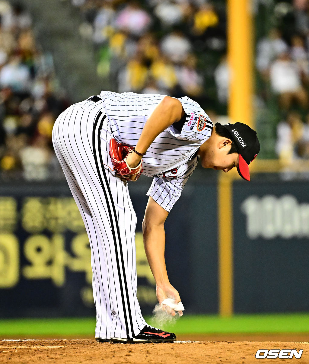5회초 1사 1,2루에서 LG 손주영이 NC 권희동에 볼넷을 허용하며 아쉬워하고 있다. 2025.10.01 /jpnews@osen.co.kr