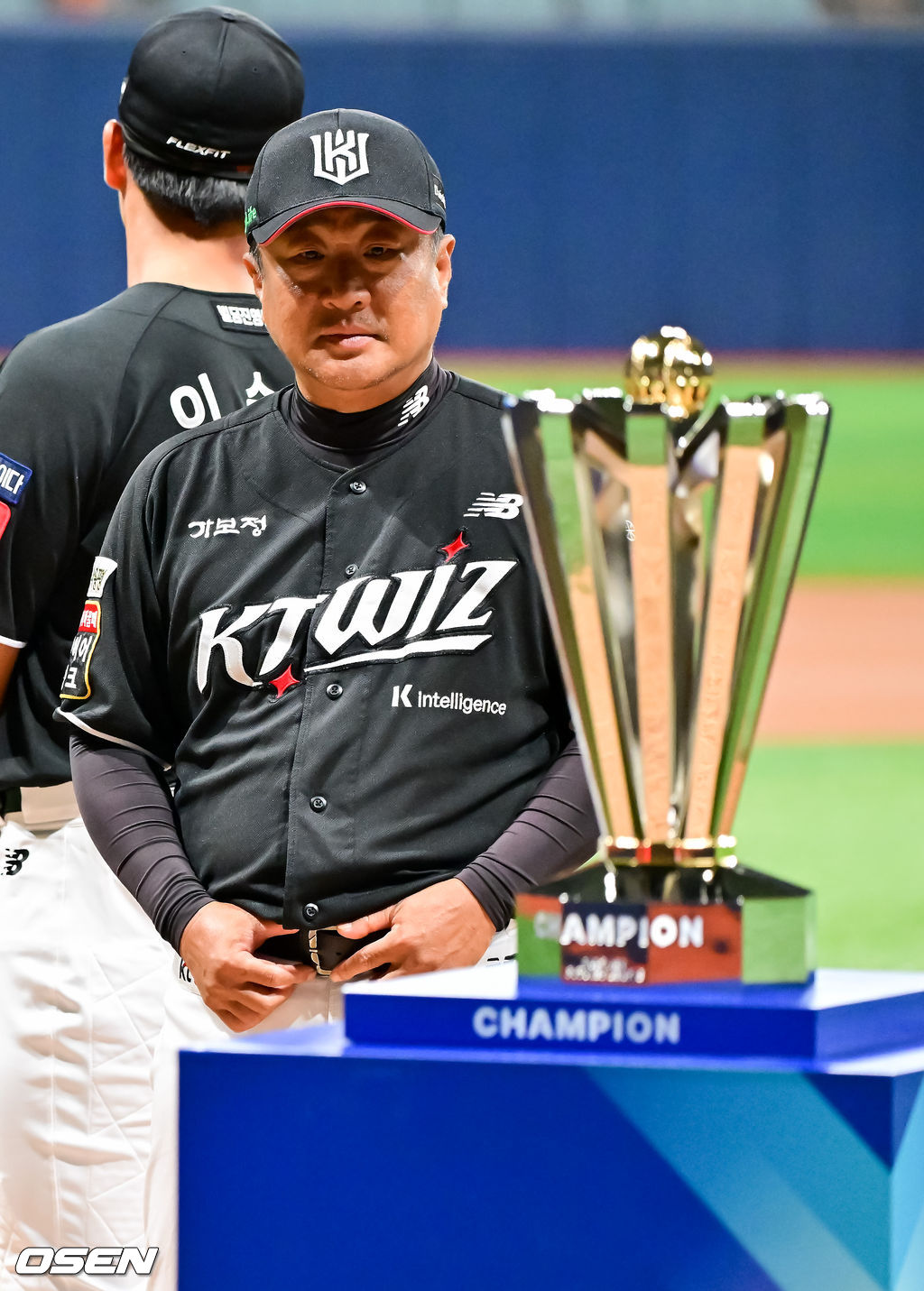 경기 앞서 KT 김호 감독이 우승 트로피를 바라보고 있다. 2025.10.01 / soul1014@osen.co.kr