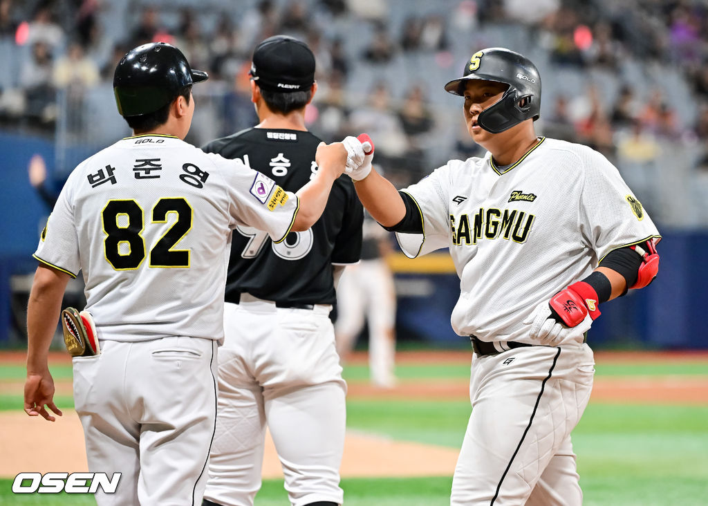 3회말 2사 1루 상무 한동희가 안타를 날린뒤 박준영 코치와 하이파이브를 하고 있다. 2025.10.01 / soul1014@osen.co.kr