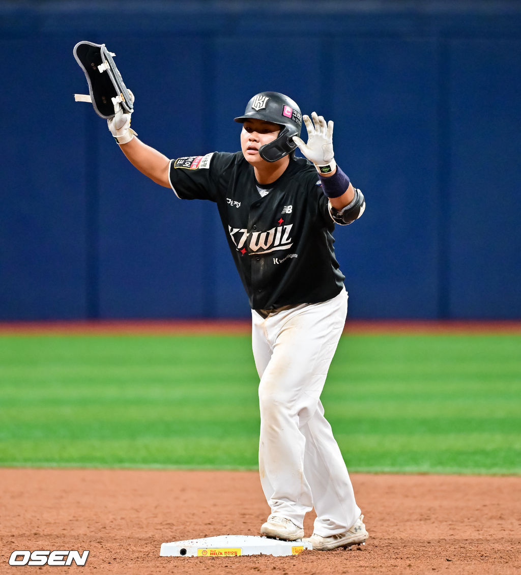 4회초 2사 1루 KT 김민석이 1타점 적시 2루타를 날리고 타임을 요청하고 있다. 2025.10.01 / soul1014@osen.co.kr