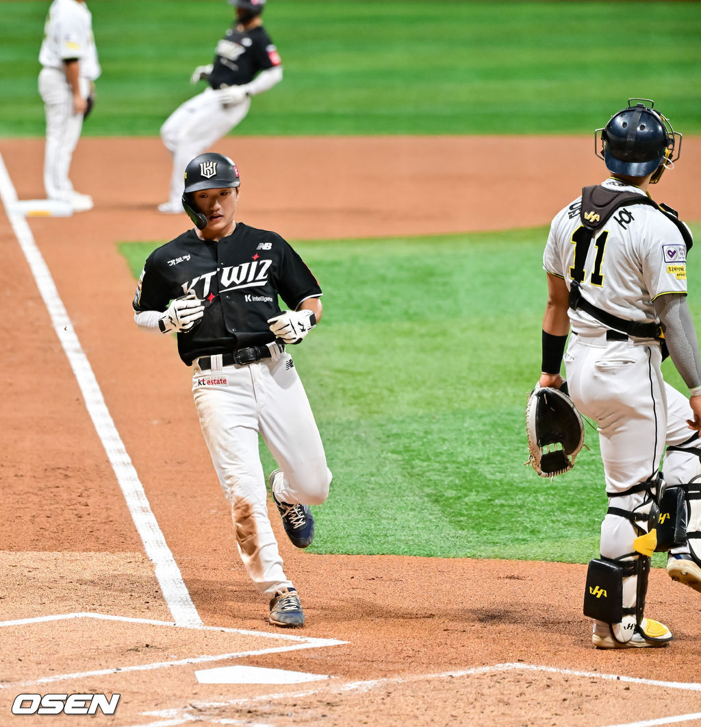 1회초 1사 2,3루 KT 이승현의 선취 1타점 희생플라이때 3루 주자 정영웅이 홈을 밟고 있다. 2025.10.01 / soul1014@osen.co.kr