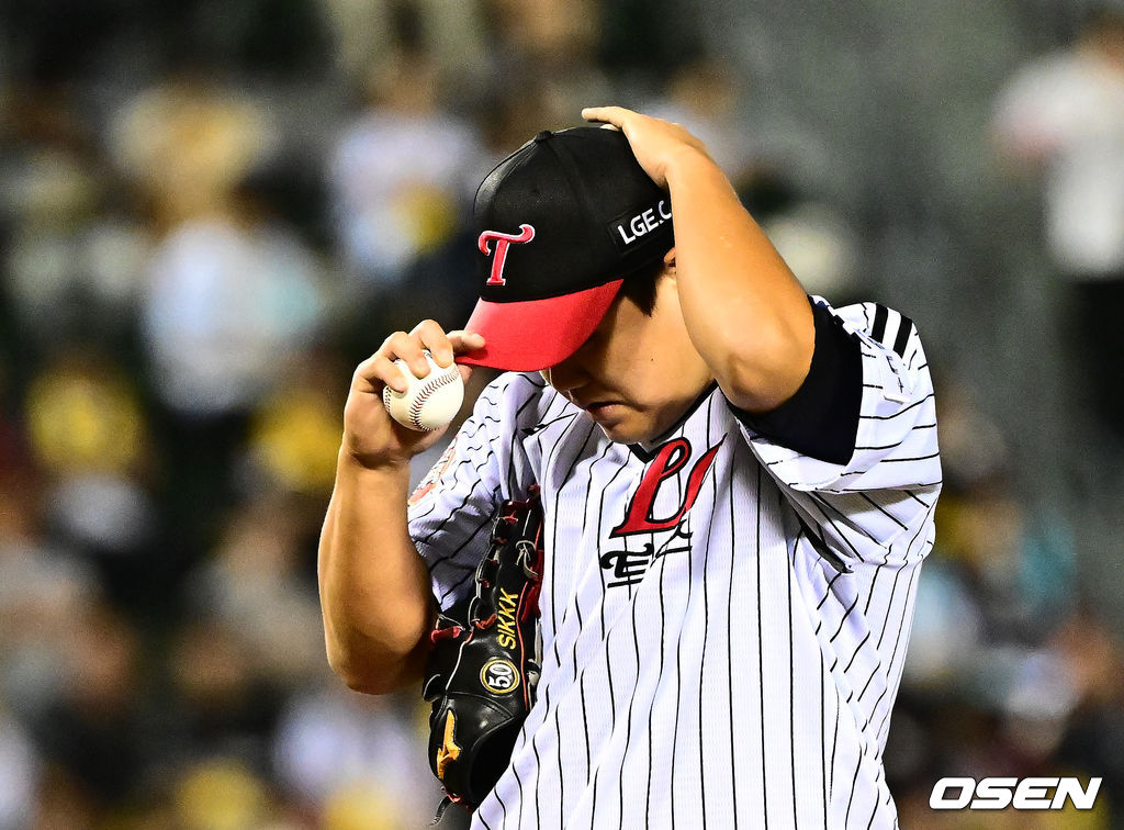 8회초 무사 1루에서 LG 장현식이 NC 김주원에 볼넷을 허용하며 모자를 고쳐쓰고 있다. 2025.10.01 /jpnews@osen.co.kr