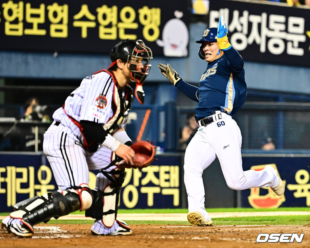 8회초 2사 2,3루에서 NC 고승완이 권희동의 2타점 우전 적시타에 홈에서 슬라이딩 세이프되고 있다. 2025.10.01 /jpnews@osen.co.kr