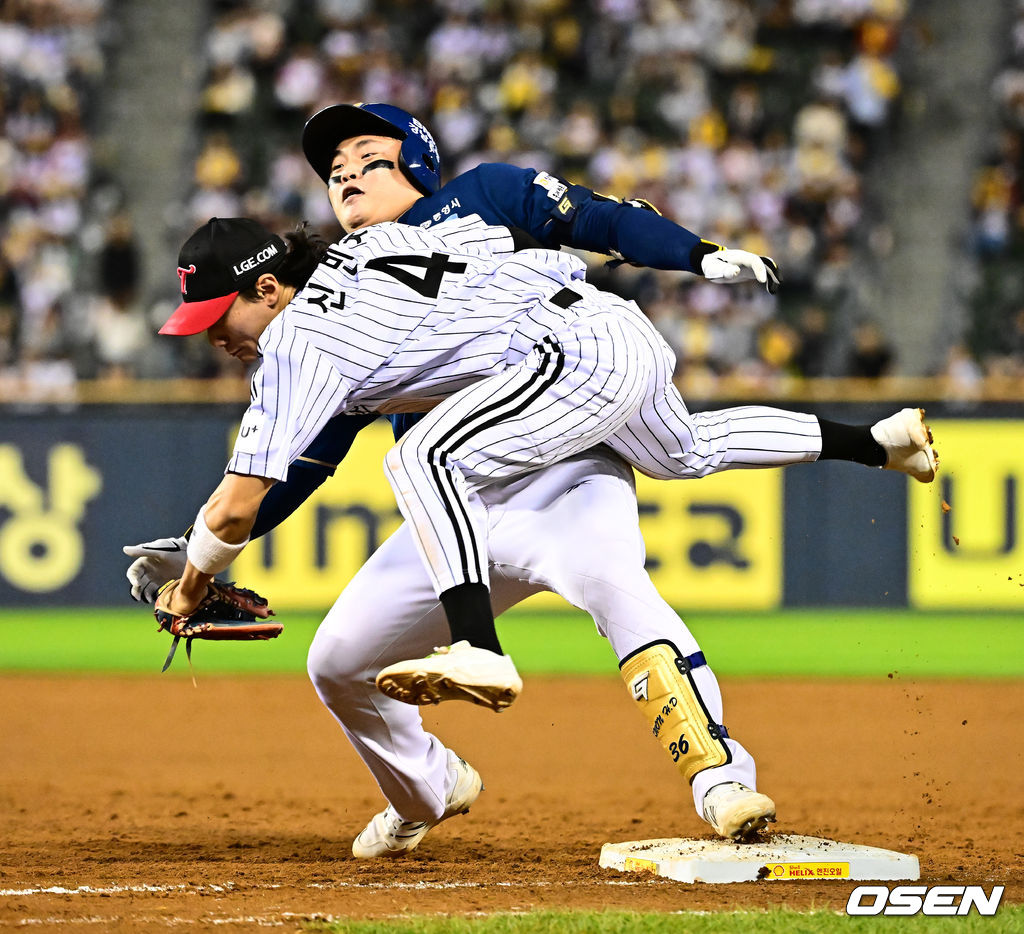 8회초 2사 2,3루에서 NC 권희동이 2타점 우전 적시타를 날리고 1루에서 LG 신민재의 태그에 앞서 세이프되고 있다. 2025.10.01 /jpnews@osen.co.kr
