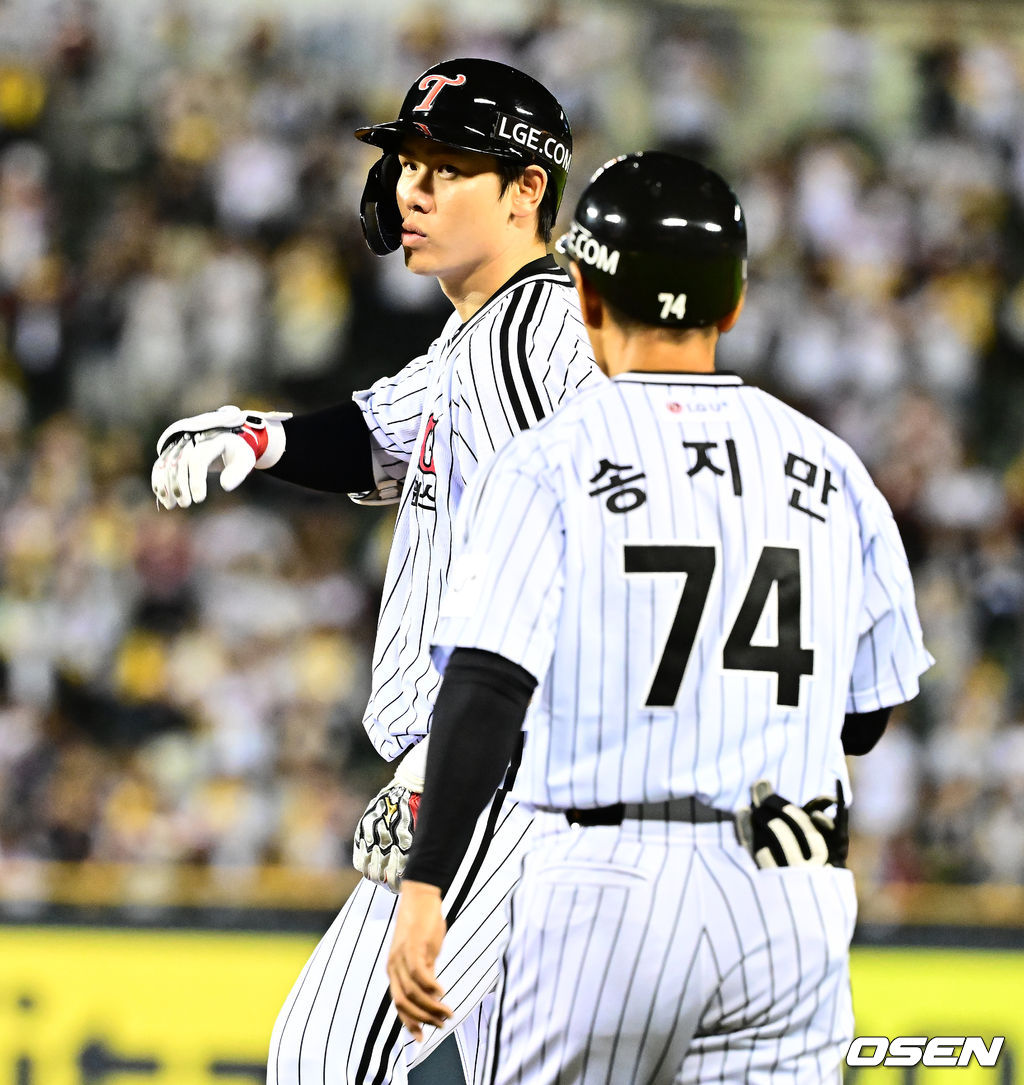 8회말 1사 1루에서 LG 홍창기가 우전 안타를 날리며 세리머니를 하고 있다. 2025.10.01 /jpnews@osen.co.kr