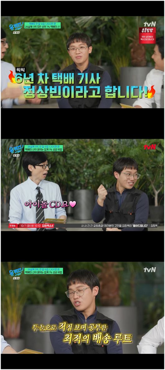 택배로 3억을 번 정상빈 씨가 출연했다. 유재석은 “오늘 출연하시느라 일을 못 하시는 거 아니냐”라며 염려했다. 정상빈 씨는 “오늘은 휴무일이라 다행이다”라고 말했다. 유재석은 “택배만으로 6년 동안 3억을 모아서 업계의 신으로 보인다”라며 정상빈 씨를 보며 감탄했다. 정상빈 씨는 “상위 1%에 들었다. 기사님들이 노하우를 물으셔서 알려드린다”라며 웃어 보였다.