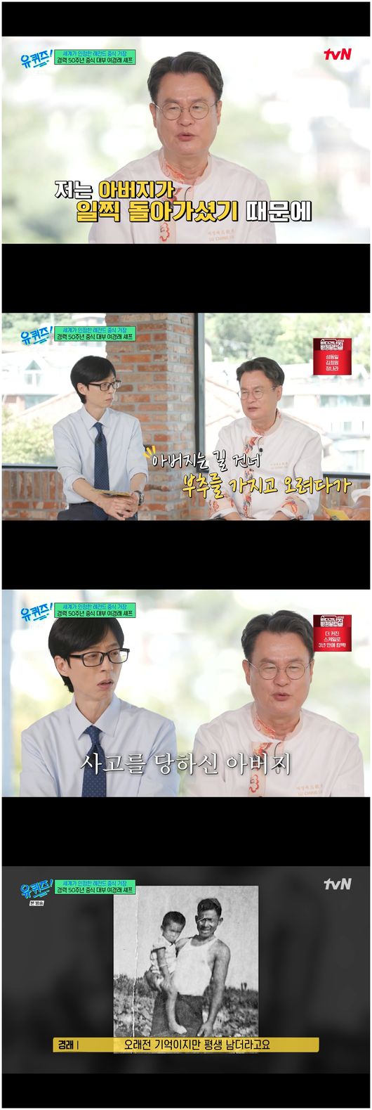 여경래는 “아버지가 돌아가신 걸 목격했다. 다섯 살 때고, 부추 농사를 지으실 때다. 극장 간다고 같이 가시다가 아버지께서 길 건너서 부추를 실으려고 오시다가 차에 치이셨다. 제가 그걸 보고 ‘아버지 죽었어’라는 말을 했다”라며 인생을 뒤바꾸었던 사건을 전했다.