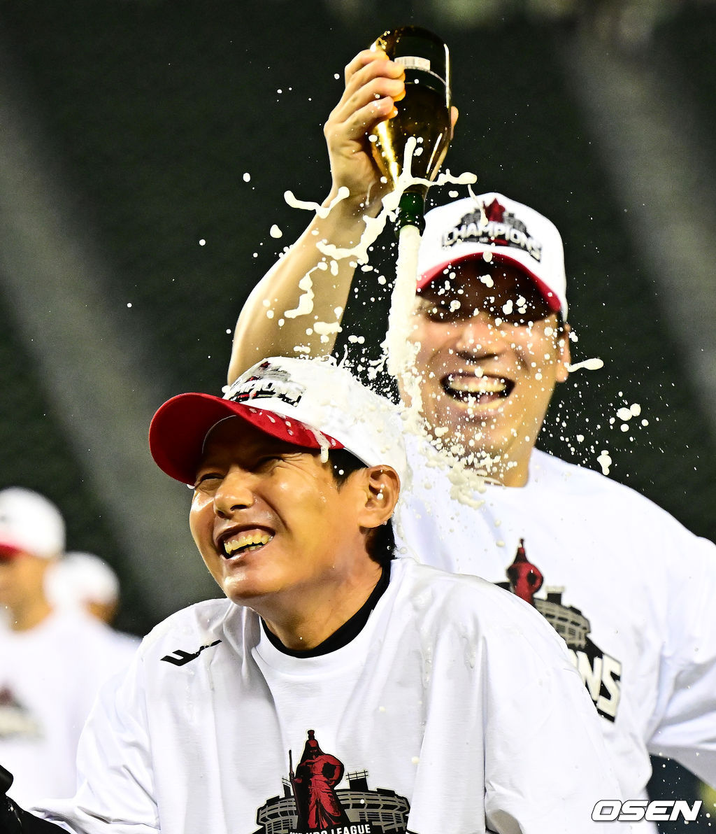 LG 염경엽 감독이 정규시즌 우승을 차지하며 김현수의 샴페인 세례를 받고 있다. 2025.10.01 /jpnews@osen.co.kr