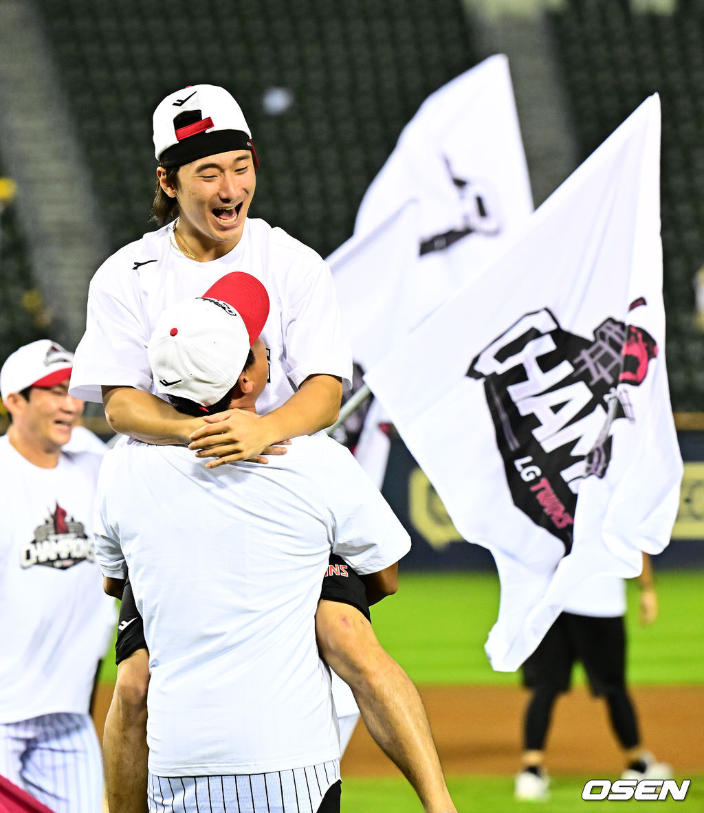 LG 신민재를 비롯한 선수들이 우승 세리머니를 하고 있다. 2025.10.01 /jpnews@osen.co.kr