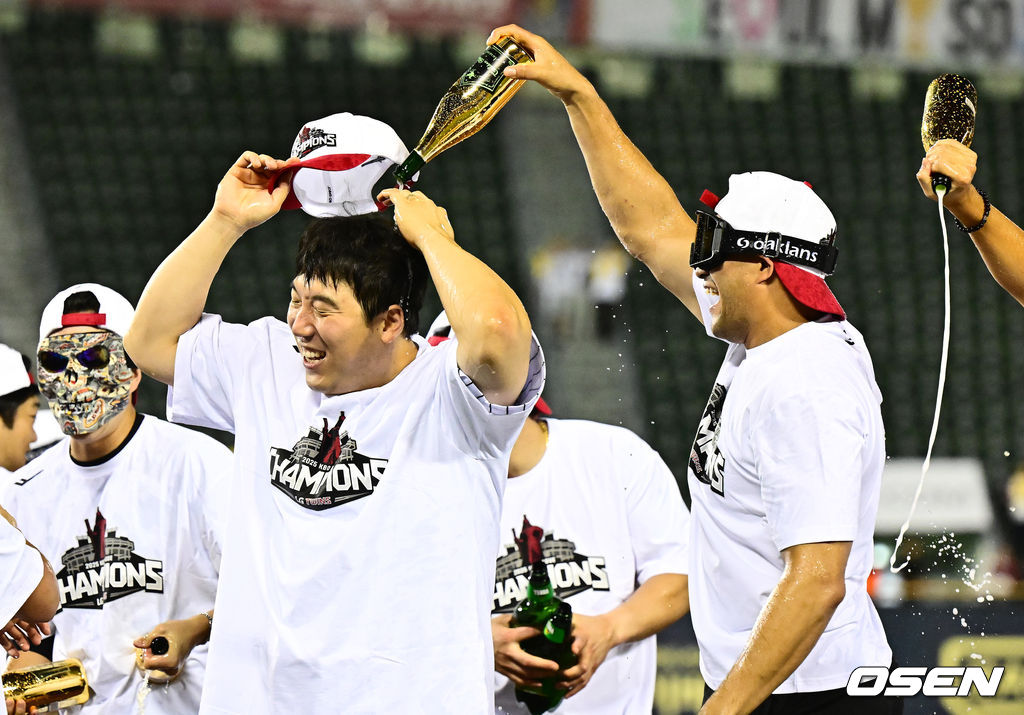 LG 김현수, 치리노스가 우승 세리머니를 하고 있다. 2025.10.01 /jpnews@osen.co.kr