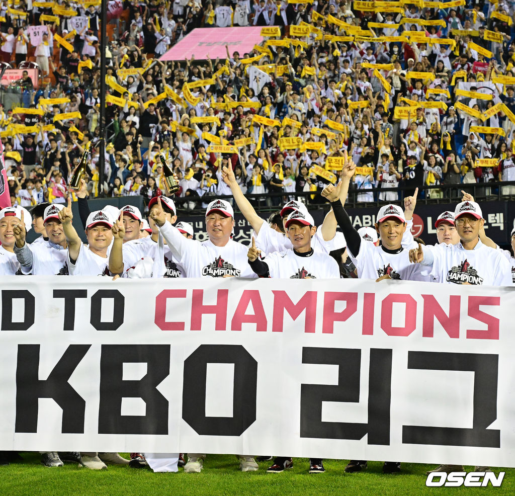 LG 차명석 단장, 염경엽 감독을 비롯한 선수단이 우승 세리머니를 하고 있다. 2025.10.01 /jpnews@osen.co.kr