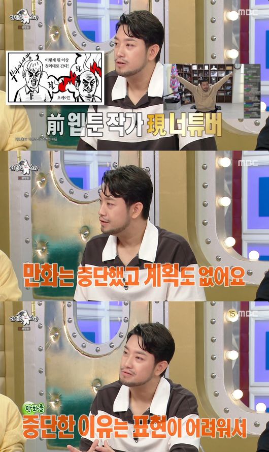 그러면서”그림과 달리 방송에서는 말로 표현이 잘 되어서 인터넷 방송으로 빠졌다”면서 앞으로도 유튜버로서 활동을 활발하게 이어가겠다고 밝혔다. 침착맨은 “기다리시는 분들이 계시는데 확실하게 만화는 그만뒀다고 말해서 인지가 된 상태다. 그래서 저를 전 웹툰작가, 현 유튜버로 소개하고 있다”고 설명했다.