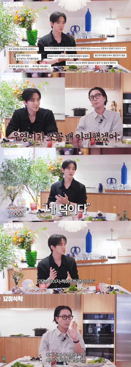 정재형은 "우영이가 예의가 발라서 그렇지만 어떤 현상을 바라보는 시선이 균형이 잡혀 있다"고 했고, 이준호는 "그렇게 얘기해주는 친구라서 고맙다. 나도 '2PM덕이지~ 찍어주신 팬덕이지'라고 했었다. 군 복무 마치고 다 같이 활동할 때 (우리집 역주행이) 큰 힘이 됐고 모두의 사기가 올라갔다"고 털어놨다.