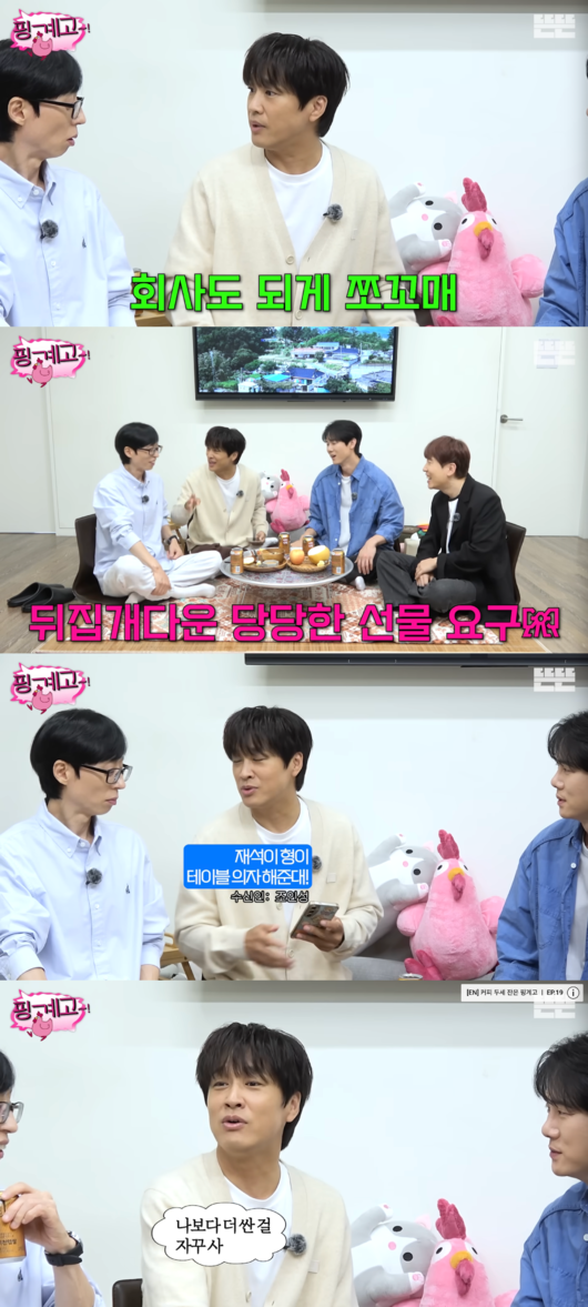 그러면서 차태현은 “인성이는 나보다 싼 걸 자꾸 산다”고 고자질해 웃음을 자아냈다. 이후 조인성은 유재석의 선물에 “감사합니다”라고 답장을 했고, 유재석은 차태현에 입금해주겠다고 약속해 웃음을 자아냈다.