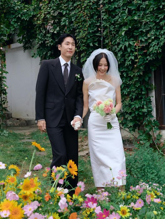 이와 함께 공개한 사진에는 색색의 꽃과 흰색 천으로 장식된 야외에서 턱시도를 입은 마이큐와 감각적인 디자인의 웨딩드레스를 입은 김나영이 포즈를 취하고 있는 모습이 담겼다.