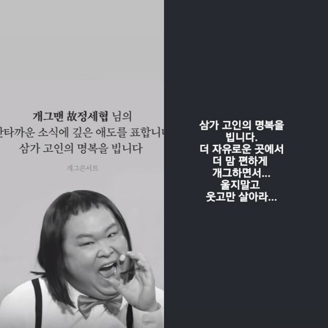 김원효는 7일 개인 SNS에 "삼가 고인의 명복을 빕니다. 더 자유로운 곳에서 더 맘 편하게 개그하면서... 울지 말고 웃고만 살아라..."라는 글을 게재했다.
