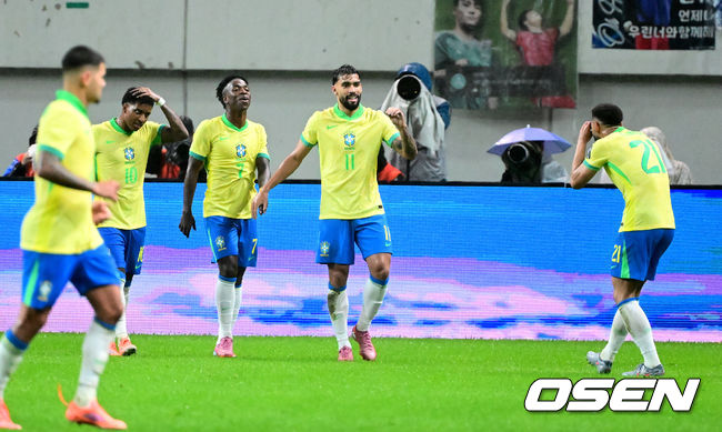 한국은 경기 내내 브라질의 빠른 템포와 유연한 전개에 끌려다녔다. 중원은 카세미루와 브루노 기마랑이스가 완벽하게 장악했고, 좌우 풀백의 오버래핑과 2선 침투가 유기적으로 맞물리며 한국 수비 라인을 계속 흔들었다. 전반 17분 이스테방의 골로 균형이 무너졌고, 후반 들어선 호드리구와 비니시우스까지 가세하며 승부는 일찌감치 기울었다.