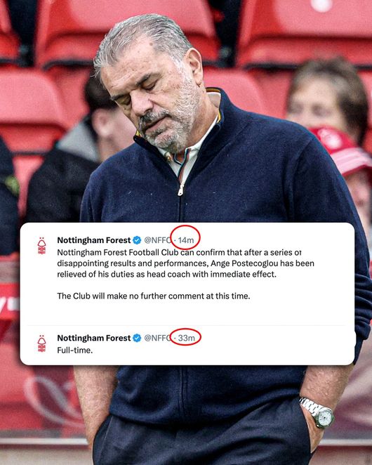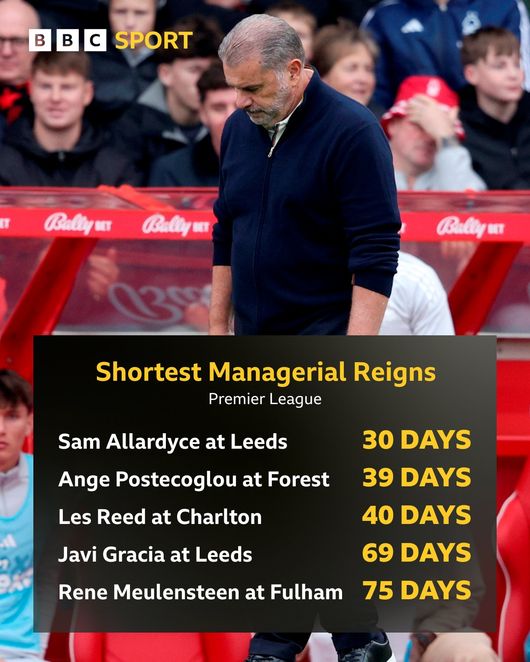 이로써 4연패에 빠진 노팅엄은 1승 2무 5패, 승점 5로 강등권인 18위까지 떨어졌다. 그러자 노팅엄 구단도 경기가 끝난 지 19분 만에 포스테코글루 감독 경질을 발표하는 결단을 내렸다. 에반겔로스 마리나키스 구단주가 종료 휘슬이 불리기도 전에 분노한 표정으로 자리를 뜨더니 그대로 공식 성명까지 이어졌다.