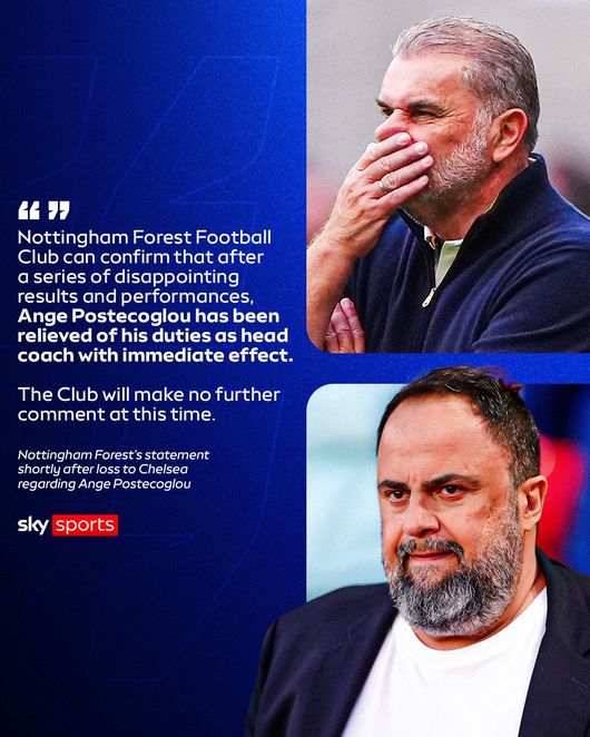 노팅엄은 같은 날 구단 홈페이지를 통해 "클럽은 일련의 실망스러운 결과와 경기력 이후 포스테코글루가 즉시 감독직에서 해임되었음을 확인할 수 있다. 지금으로서 클럽은 더 이상 언급하지 않을 것"이라고 공식 발표했다.