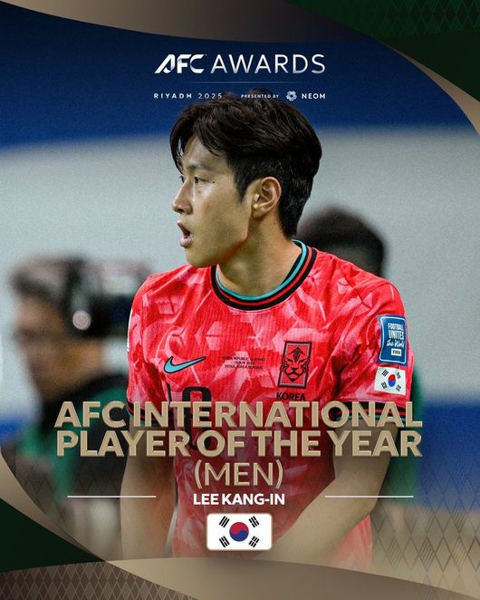 AFC는 지난 17일 공식 홈페이지를 통해 "대한민국의 아이콘 이강인은 목요일 NEOM이 주최한 AFC 어워드 리야드 2025에서 올해의 아시아 국제 선수(남자)로 선정되며 2024-2025시즌 멋진 활약을 펼친 공로를 인정받았다"라고 발표했다.