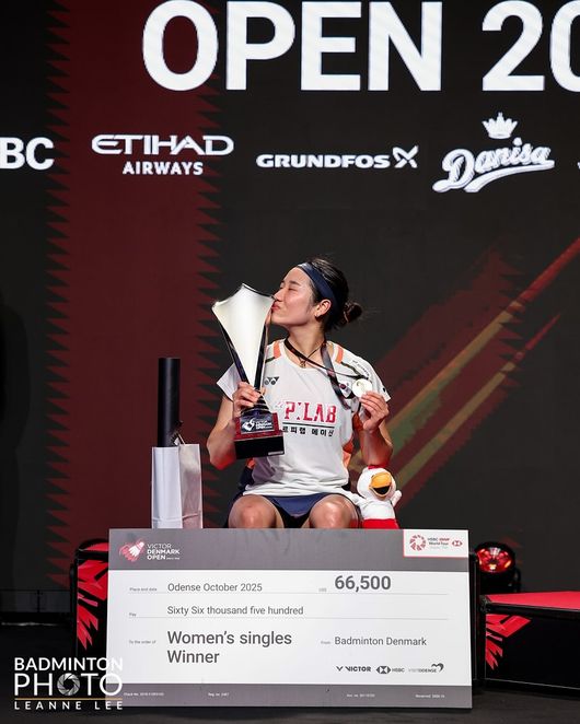 여자 단식 세계랭킹 1위 안세영은 19일(이하 한국시간) 덴마크 오덴세에서 열린 2025 세계배드민턴연맹(BWF) 월드투어 슈퍼 750 덴마크 오픈 결승에서 왕즈이(중국)를 2-0(21-5 24-22)으로 제압했다.