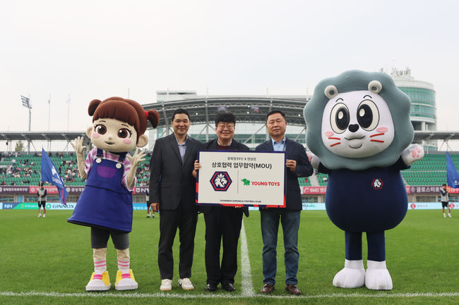 충북청주프로축구단이 19일 청주종합경기장에서 열린 하나은행 K리그2 2025 35라운드 전남드래곤즈전에서 국내 대표 완구기업 ㈜영실업과 IP(지식재산권) 기반 공동브랜딩 및 마케팅 협력 업무협약(MOU)을 체결했다.