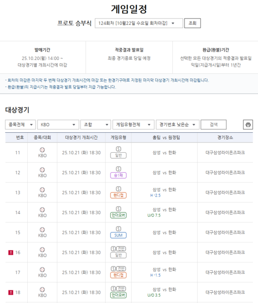프로토 승부식 124회차, KBO 포스트시즌 PO 3차전 삼성(홈)-한화(원정)전 대상 게임 마감 임박