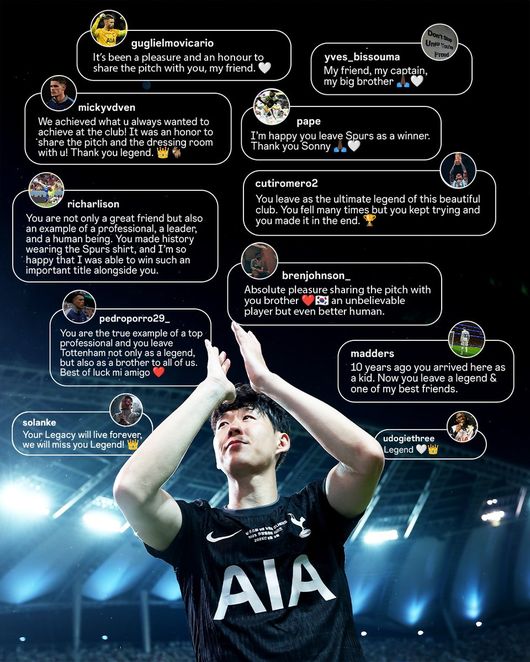 토트넘 구단도 그를 향한 찬사를 아끼지 않았다. 손흥민의 LAFC 이적을 발표하며 “그는 우리 역사상 가장 위대한 선수 중 하나”라며 “유로파리그 우승으로 10주년을 장식했고, 이제 450경기 이상을 뛴 네 번째 선수가 됐다”고 밝혔다. 또한 “푸스카스상과 득점왕, 그리고 주장으로서의 첫 트로피까지 — 그는 클럽의 진정한 상징이다”라고 덧붙였다.