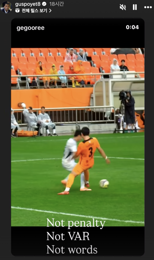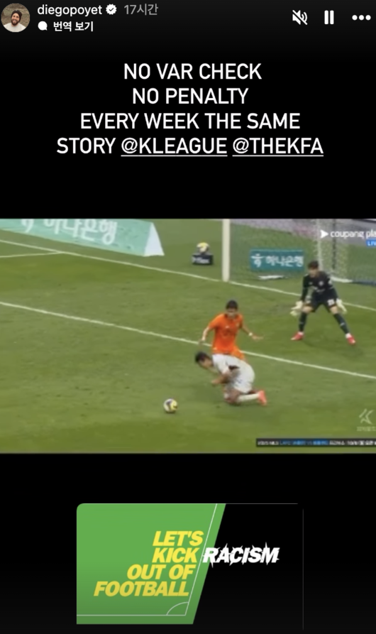 포옛 감독의 아들인 디에고 포옛 전북 분석코치도 같은 생각이었다. 그 역시 소셜 미디어 계정에 전진우가 밟혀 넘어지는 영상을 공유하며 "VAR도 보지 않고 페널티킥도 주지 않는다. 매주 똑같다"라고 K리그 심판진을 저격했다.