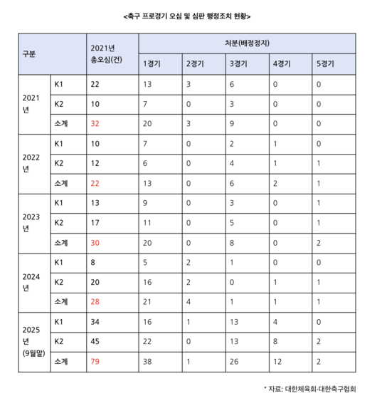 2025년 들어 K리그 경기 오심 수위도 상당히 높아졌다. 오심 총 79건으로 인해 심판의 1경기 배정정지가 나온 건 38건으로 전체의 48.1%를 차지한다. 3경기 이상 중징계 경우는 40건(50.6%)으로 절반을 넘어섰다. 2021년부터 2024년까지는 전체 오심의 60~75%가 1경기 정지로 마무리됐지만 올해 들어선 3경기 이상(최대 5경기) 배정 정지 사례가 급증한 것이다. 중징계 건이 수직상승 했단 건 심판으로서 해선 안될 판정이 과거보다 올해 상당히 많이 일어나고 있단 것을 뜻한다.